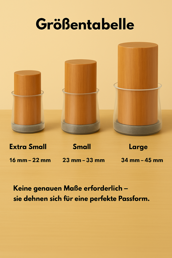 Mit GlideGuard™ gehört das der Vergangenheit an. Diese intelligenten Stuhlbeinschoner sorgen dafür, dass deine Stühle sanft und geräuschlos über den Boden gleiten – ohne Spuren zu hinterlassen. Die flexible Silikonpassform schmiegt sich perfekt an jedes Stuhlbein an, während die weiche Filzunterseite deinen Boden zuverlässig vor Kratzern und Abnutzung schützt. Kein Kleber, kein Werkzeug – einfach aufsetzen und sofort Ruhe, Schutz und Komfort bei jeder Bewegung genießen.